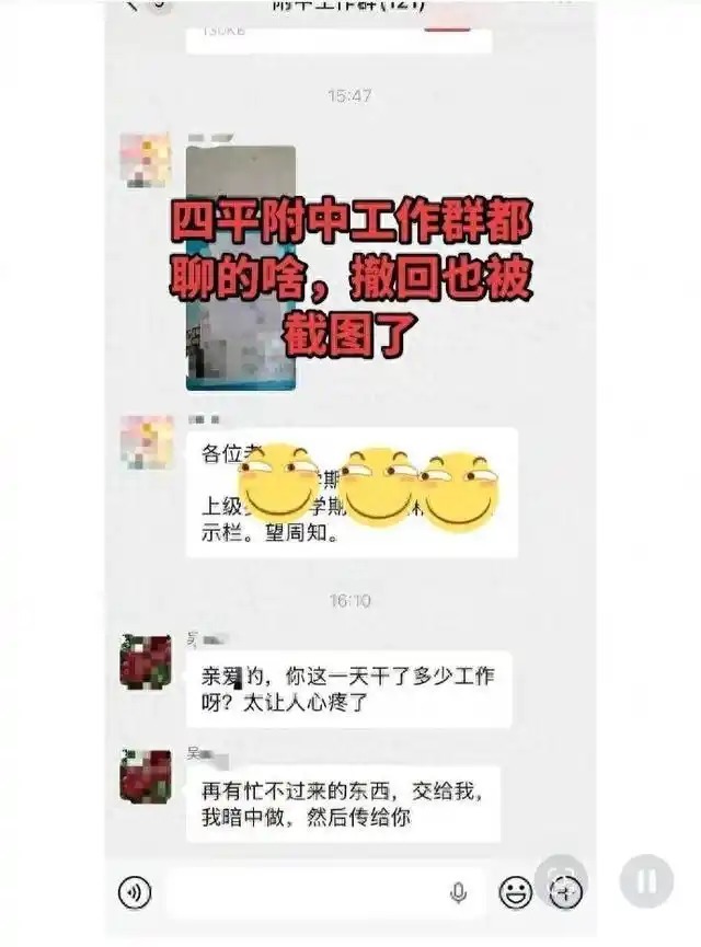 截图信息显示,在一个名为“附中工作群”的聊天群中,15时47分,有人发布了一则通知。16时10分,一个名为吴某的账号接连发布了“亲爱的,你这一天干了多少工作呀?太让人心疼了”“再有忙不过来的东西,交给我,我暗中做,然后传给你”两条文字信息。 有发布者称,吴某为吉林师范大学附属中学副校长,事后该消息被撤回,但被人截图保存。该截图在网上流传开来后,引发热议。有人认为,这则“亲密消息”是发给群内某位女教职工的,并关联到了该校某位女性工作人员。但也有人认为,可能只是将私人消息误发到工作群。