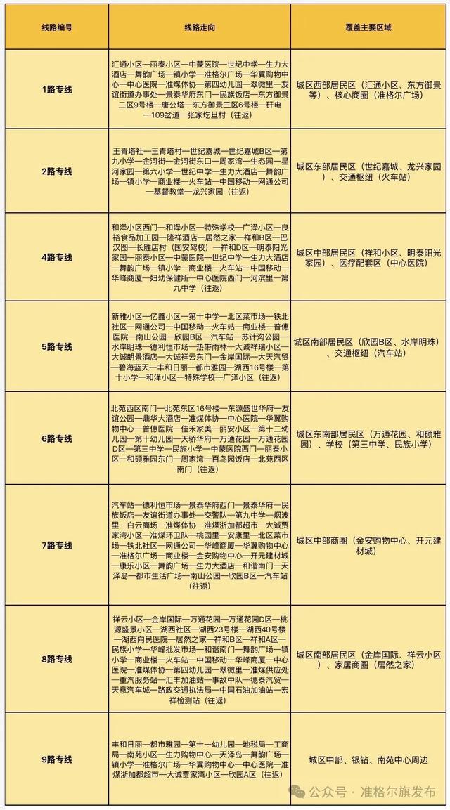 1号线:准格尔旗第九中学(河滨里)—白云商场—中心医院—华翼购物中心—镇小学—舞韵广场—世纪中学—中蒙医院—美稷·长河里夜未央不夜城西门